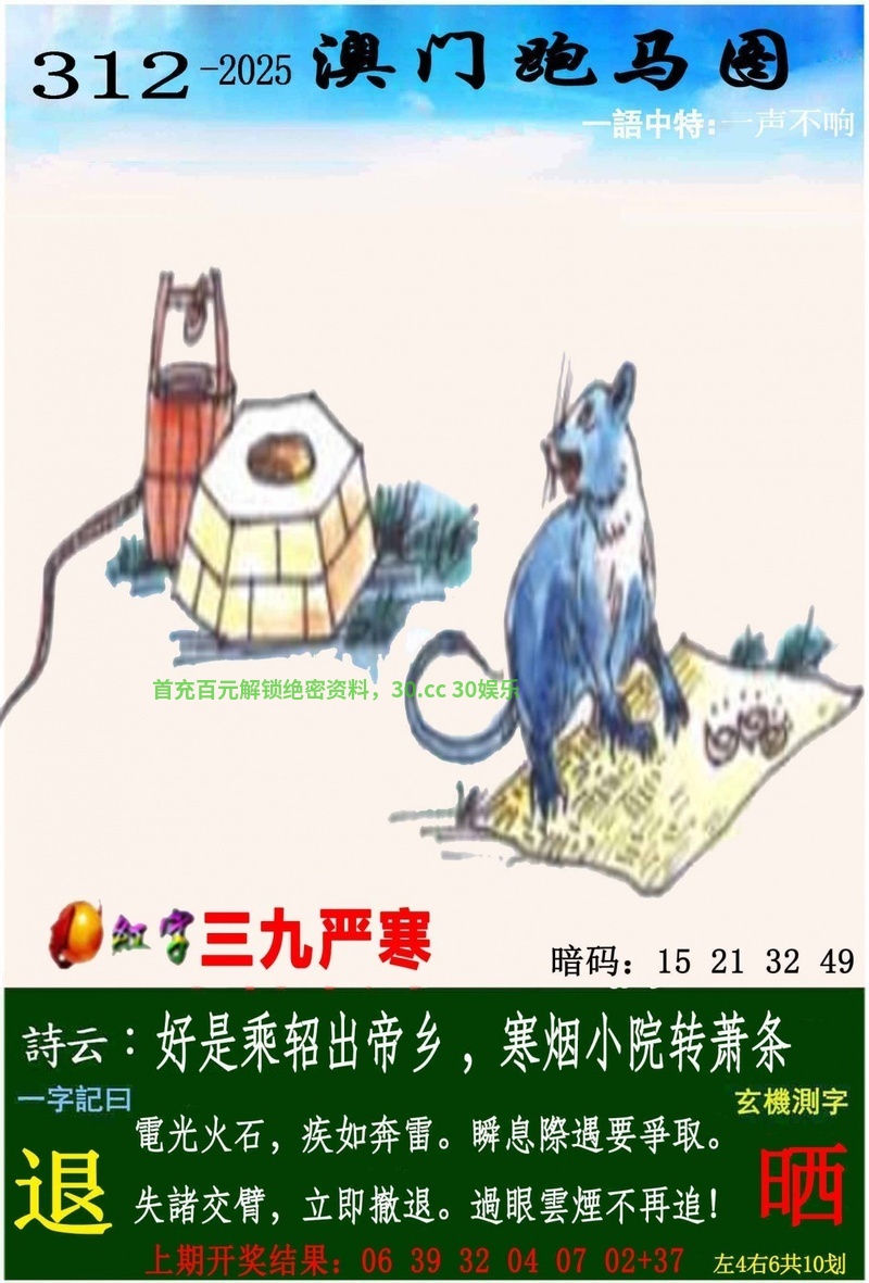 312期一字記曰:【退】 電光火石,疾如奔雷。瞬息際遇要爭取。失諸交臂,立即撤退。過眼雲煙不再追!【晒】 解:寒烟小院转萧条:小院解小肖蛇鼠鸡兔龙猴 综合取肖:蛇鼠鸡兔龙猴 |