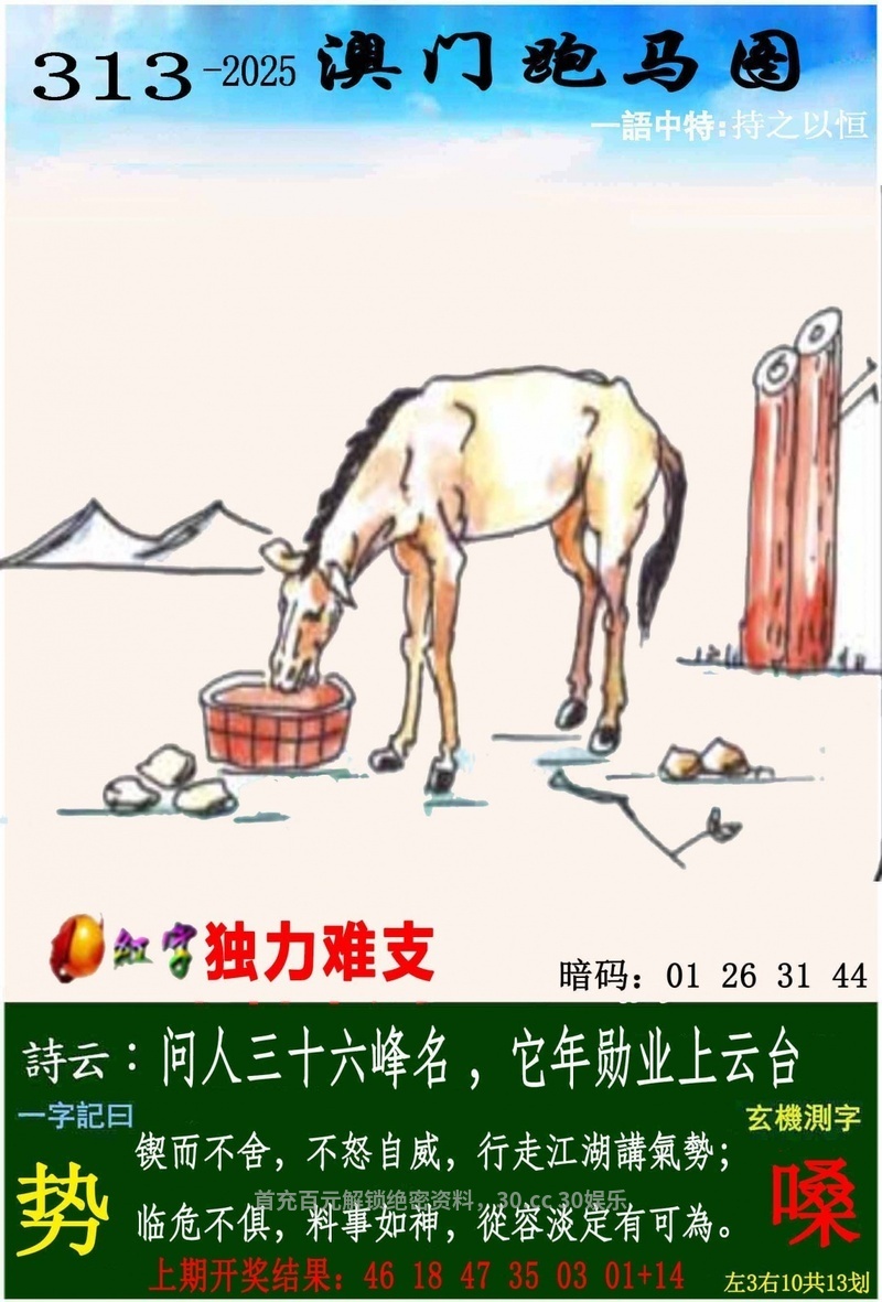 313期一字記曰:【势】 锲而不舍,不怒自威,行走江湖講氣勢;临危不俱,料事如神,從容淡定有可為。【嗓】 解:从容淡定有可为解猴蛇鸡鼠龙牛 综合取肖:猴蛇鸡鼠龙牛 |